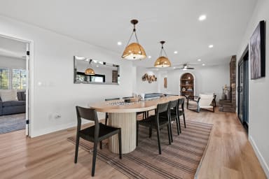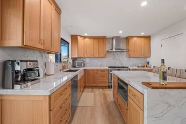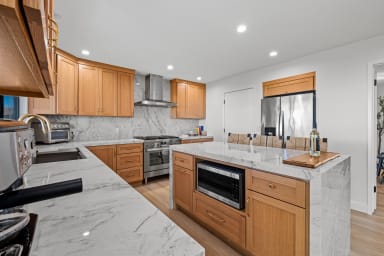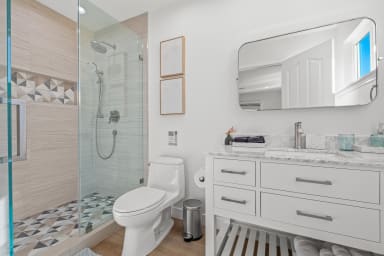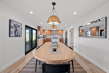 This well-designed home features three bedrooms and three baths, exuding comfort and style. The heart of the home lies in the fully stocked chef's kitchen, where culinary adventures await amidst top-of-the-line appliances, elegant finishes of white oak, gorgeous Dekton countertops and kitchen island, a 45” kitchen sink with dual faucets, and ample space for creating unforgettable meals. Gather around the expansive communal dining table, perfect for sharing stories and savoring delicious meals with loved ones. We provide coasters to protect the dining table and encourage you to use them. =)