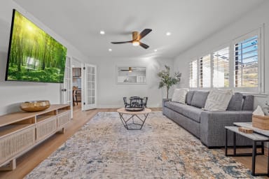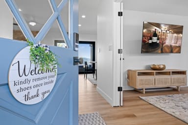 - No Shoes Indoors: To maintain the immaculate cleanliness of the home, we provide cozy, single-use slippers for all guests and ask you to remove shoes by the door. We advise you to bring slippers or slides to comfortably walk around the stone surfaces surrounding the pool area. There are a few uneven flagstones around the pool, so please be mindful.