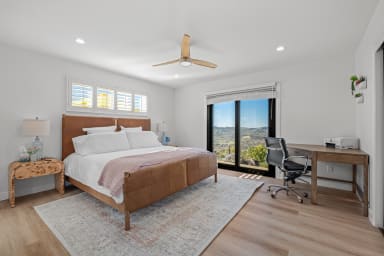 PRIMARY BEDROOM: The primary bedroom offers stunning, panoramic views, a corner desk, and a delightful en-suite bathroom with a walk-in shower.