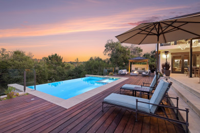 Heated, chlorine-infused, shallow infinity pool & spa, perfect for day or night swims, with an electric cover. Pool temperatures are around 75°F in the summer without heating, and we ask not to heat the pool during the winter months. Walking children are not permitted as there are unprotected heights (20 feet) over the edge of the infinity pool.